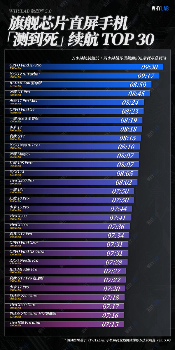 Una serie simile di test di WhyLab dà risultati identici. Il Find X9 Pro si aggiudica il primato con un tempo totale di 9h30m, mentre lo Xiaomi 17 Pro Max dura solo 8h24m.