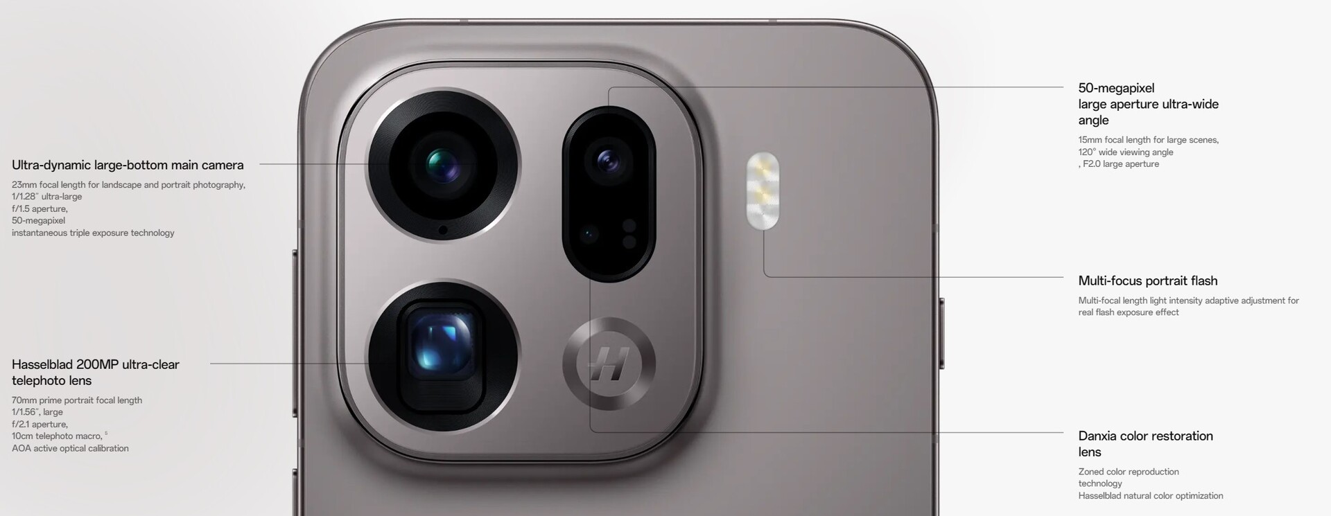 Oltre alla gigantesca batteria da 7.500 mAh alloggiata in un corpo sottile da 8,25 mm, la fotocamera con zoom teleobiettivo e sensore Samsung da 200 MP è la caratteristica principale di Oppo Find X9 Pro. La fotocamera Hasselblad Telephoto da 200 MP è stata co-sviluppata in termini di calibrazione del sensore e design ottico per adattarsi al nuovo Hasselblad Master Camera System alimentato dal nuovo motore di immagine Lumo di Oppo, che controlla le seguenti caratteristiche e hardware della fotocamera di Find X9 Pro: