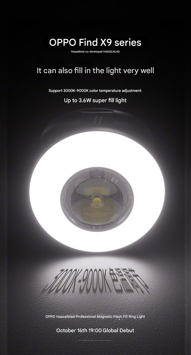 Oltre a questo, Oppo ha rivelato un accessorio magnetico per la luce di riempimento per la serie Find X9. Promette di illuminare le scene fino a 2.200 lux e Oppo sottolinea che gli utenti possono regolare la temperatura del colore da 3.000 a 9.000 Kelvin. Questo accessorio dovrebbe funzionare anche con OnePlus 15 e con alcuni modelli di iPhone (custodia in silicone iPhone 17 Pro MagSafe, al momento 37 dollari su Amazon).
