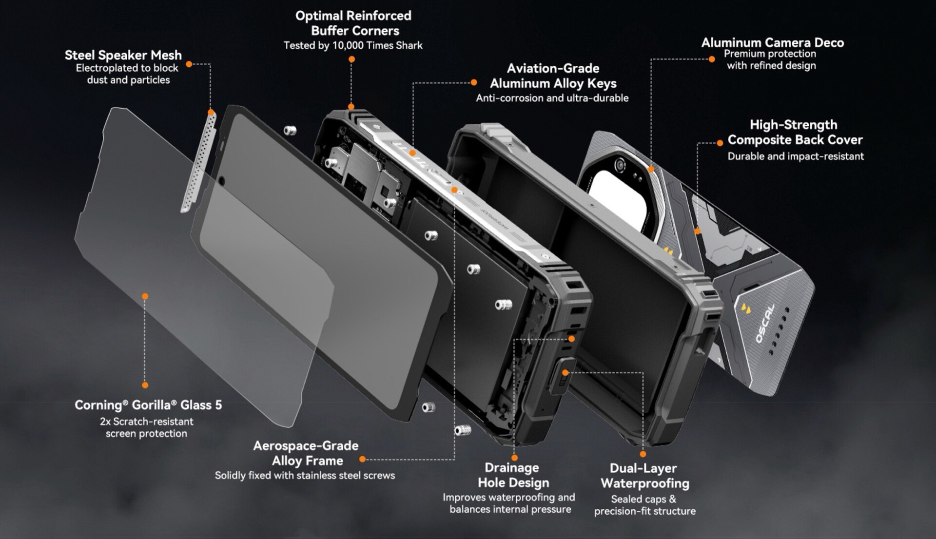 Oscal dispone di una fotocamera principale da 64 MP f/1.8 con un sensore da 1/2 pollice, una fotocamera per la visione notturna da 20 MP f/2.2 con un sensore da 1/2,78 pollici e una fotocamera per selfie da 50 MP. Il display principale da 6,78 pollici ha una risoluzione di 1.080p+, una frequenza di fotogrammi di 120 Hz e una luminosità di 700 nit. All'interno dello smartphone c'è un MediaTek Dimensity 7050