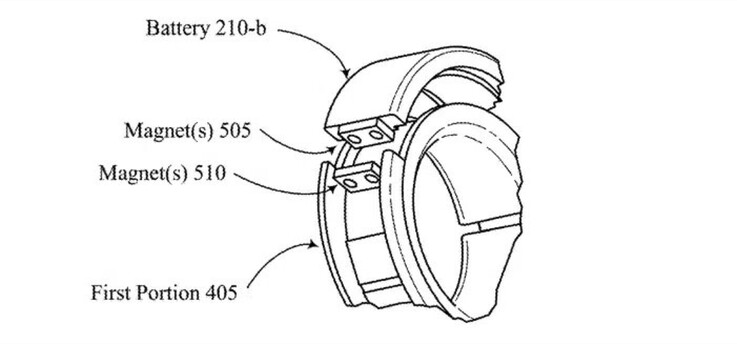 Come mostrano le illustrazioni, la batteria si trova in una metà dell'anello. La parte esterna, in cui si trova la batteria, può essere facilmente rimossa e sostituita, se necessario. Sia il modulo della batteria che l'anello contengono piccoli magneti che mantengono la batteria in posizione. I contatti metallici consentono di trasmettere la corrente dalla batteria all'anello, in modo che gli utenti non debbano armeggiare con piccoli spinotti per sostituire la batteria.