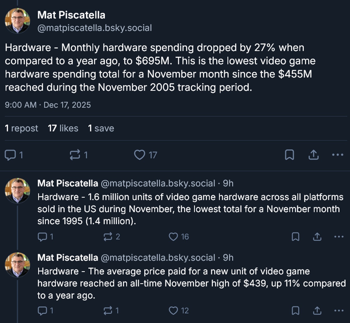 Sony può festeggiare il rapporto Circana, ma ci sono segnali di allarme per il mercato hardware. Le vendite totali sono diminuite del 27% rispetto allo stesso periodo del 2024. La spesa ha raggiunto i 695 milioni di dollari, il totale di novembre più basso dal 2005. I rivenditori hanno venduto 1,6 milioni di unità, il peggior risultato dal novembre 1995.