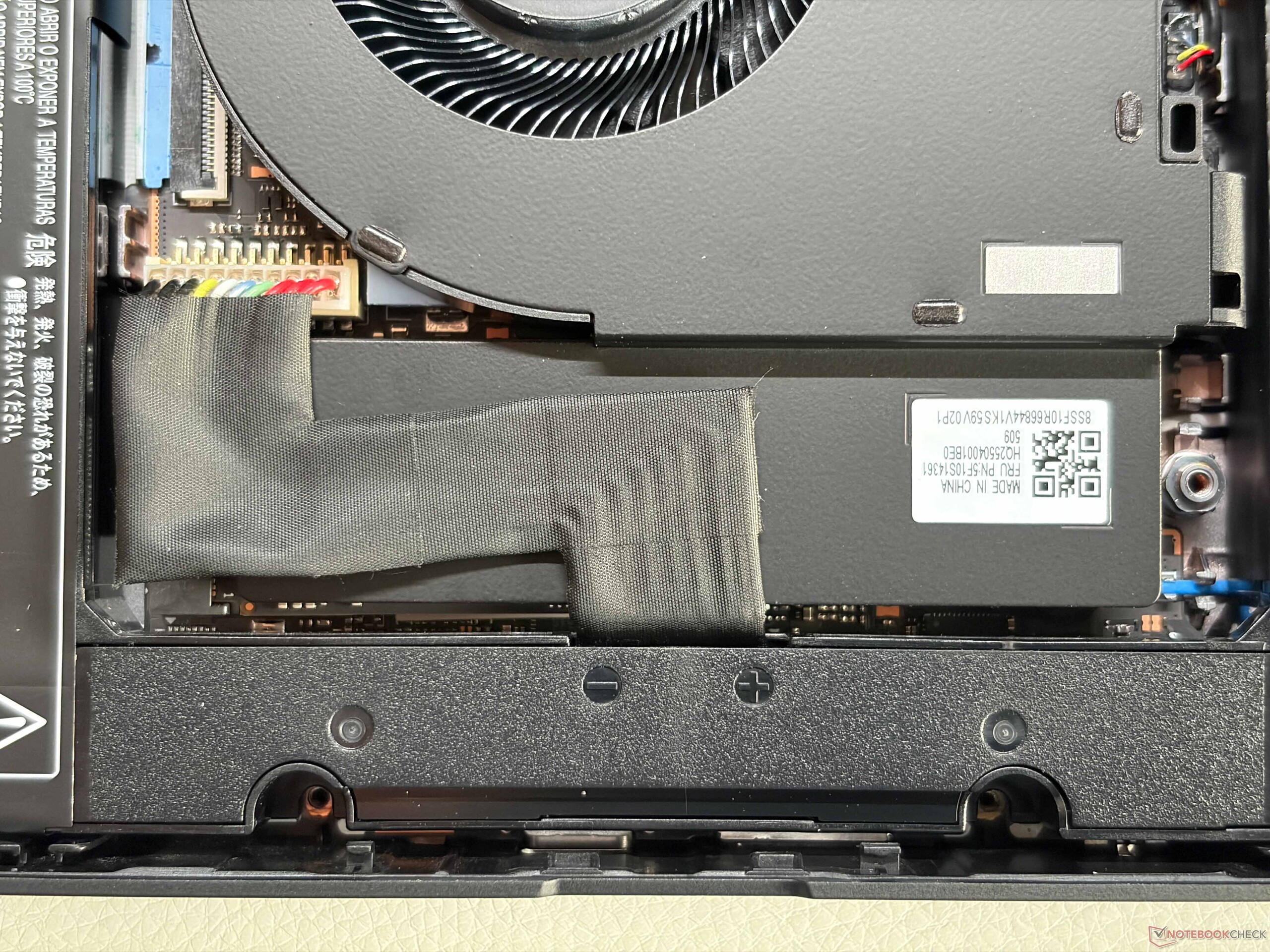 Internamente, anche il layout è stato ridisegnato. Le batterie sono ora posizionate su entrambi i lati, con una singola ventola al centro. L'SSD M.2 2280 si trova sotto e può essere sostituito, anche se prima è necessario scollegare un cavo di collegamento. Nonostante il prezzo elevato, il dispositivo non supporta ancora il Wi-Fi 7.