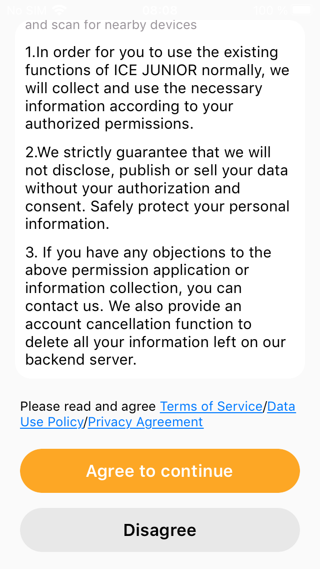 Durante la ricarica, è meglio scaricare l'applicazione ICE Junior (disponibile per Android e iOS), che può essere utilizzata anche in modalità "ospite". Leggendo l'informativa completa sulla privacy, tuttavia, si ha l'impressione che il produttore possa raccogliere una discreta quantità di dati, eventualmente memorizzarli al di fuori dell'UE e condividerli con fornitori terzi - non proprio l'ideale per un prodotto per bambini. L'accoppiamento con l'app è semplice, purché vengano concessi tutti i permessi.