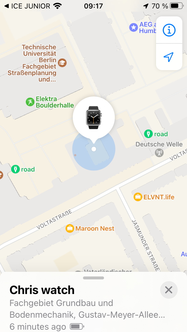 Tornato a casa, l'iPhone ha aggiornato correttamente la posizione, spostandosi da casa nostra alla palestra di arrampicata. Tuttavia, se suo figlio si trova in un luogo senza dispositivi Apple nelle vicinanze, la localizzazione non funziona. È qui che gli orologi con GPS o SIM sono chiaramente in vantaggio.
