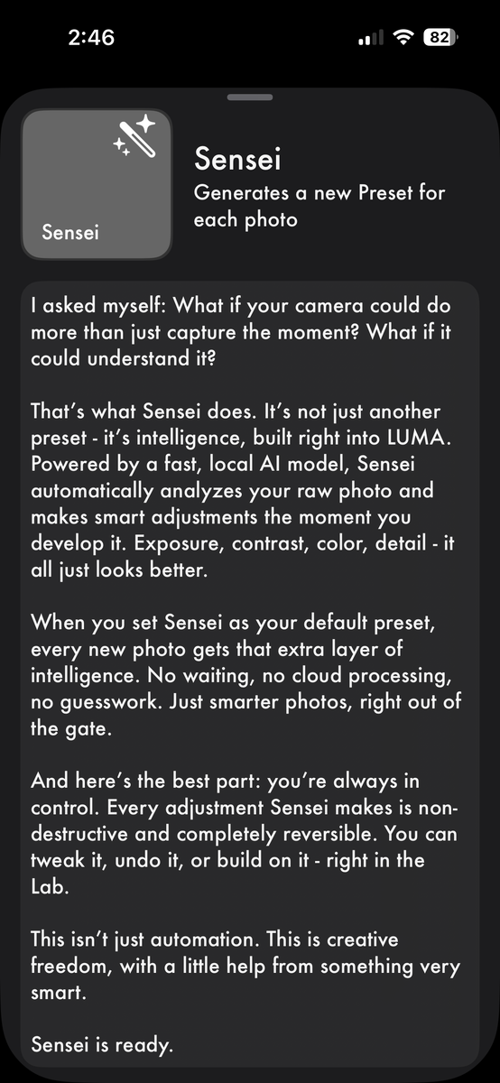 Questo, in combinazione con la nuova pipeline di elaborazione delle immagini, consente la caratteristica unica della fotocamera Luma: il pulsante "Test". Le foto grezze sono notoriamente difficili da catturare quando si tratta di gestire l'esposizione, e quindi ora basta tenere premuto questo pulsante per ottenere un'anteprima veloce e compatibile con l'EDR direttamente nel mirino... Per quanto riguarda la condivisione dei Preset, tecnicamente sono già condivisibili tramite trasferimento di file, perché sono accessibili dall'applicazione File. Ho l'obiettivo approssimativo di ospitare un mercato leggero di Preset per gli utenti che possono pubblicare i loro stili, ma credo che sia ancora un po' presto per farlo. In realtà questa era una funzione già presente in Luma 2, ma era decisamente troppo presto.