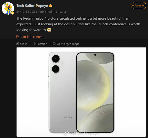 La fuga di notizie proviene dal sito di social media cinese Weibo che rivela un potenziale design dell'imminente Redmi Turbo 4, che, come già detto, sarà probabilmente lanciato come Poco F7 a livello internazionale. L'immagine trapelata rivela una configurazione di doppia fotocamera posteriore allineata verticalmente. Sul lato anteriore, è visibile un display piatto con cornici ridotte e una tacca con foro simile a quella del predecessore.
