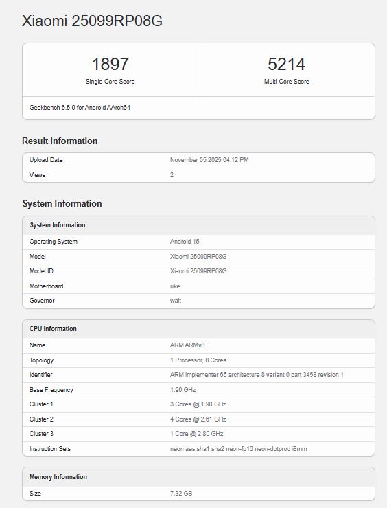 I punteggi testati per questo nuovo dispositivo - 1.897 nel test single-core e 5.214 nel test multi-core - sono entrambi a distanza ravvicinata dallo Xiaomi Pad 7 nei nostri test interni. Inoltre, l'elenco conferma la presenza di 8 GB di RAM e Android 15 sul dispositivo.