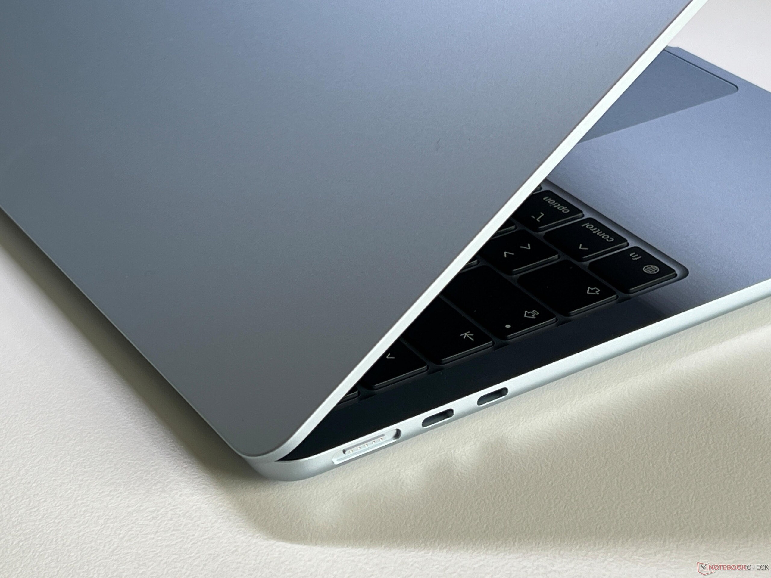 Il design dello chassis, compresi i dispositivi di input, è identico a quello del modello precedente modello precedente e il corpo unibody in alluminio è ancora molto sottile, anche se l'Air rimane un po' più pesante di alcuni dei suoi rivali, con 1,xx kg. La connettività è ancora piuttosto limitata con MagSafe, audio da 3,5 mm e due porte USB-C con Thunderbolt 4. Apple ha però risolto la nostra critica sul Wi-Fi e l'Air ora supporta l'ultimo Wi-Fi 7, compreso il Bluetooth 6.0 tramite il chip N1 di Apple. Le prestazioni nel nostro test Wi-Fi standardizzato non erano però perfettamente coerenti e i risultati potevano essere migliori, ma gli effetti per l'uso quotidiano sono trascurabili. Le immagini seguenti provengono dal modello precedente.