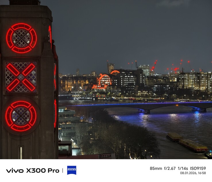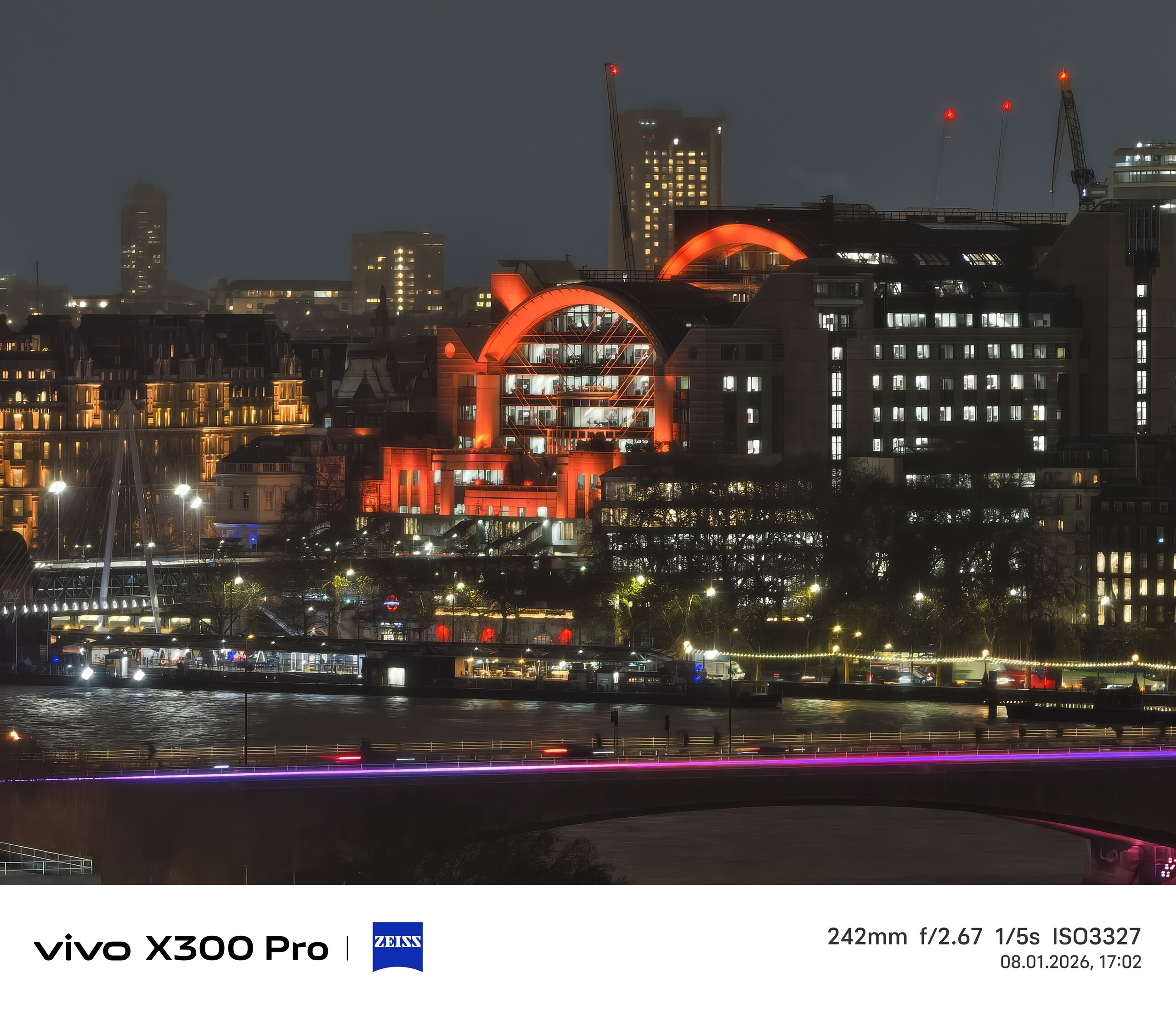 Di notte, Vivo X300 Pro beneficia del suo hardware più sensibile alla luce e offre una migliore qualità d'immagine, particolarmente evidente nei dettagli fini come gli alberi sulla riva (1a immagine) o la ringhiera del ponte (2a immagine).