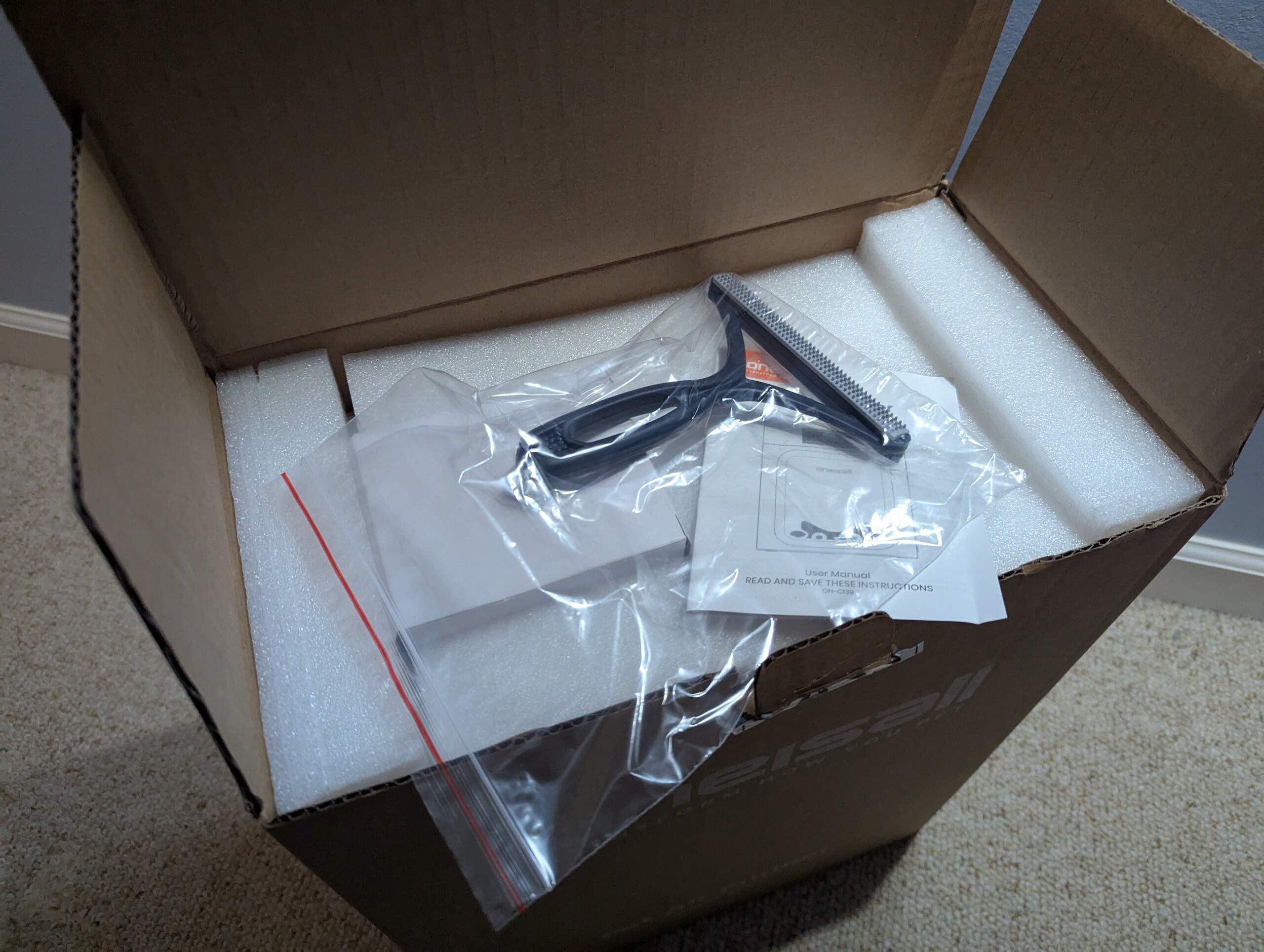 Il Oneisall PP02 è arrivato in un imballaggio minimo, con tutto avvolto nella plastica. La confezione comprende l'unità principale, i set di filtri doppi (preinstallati) e una spazzola dedicata ai pelucchi. La spazzola è stata una bella aggiunta e può aiutare gli utenti a mantenere i pre-filtri lavabili e a prolungare la durata dei filtri HEPA primari.
