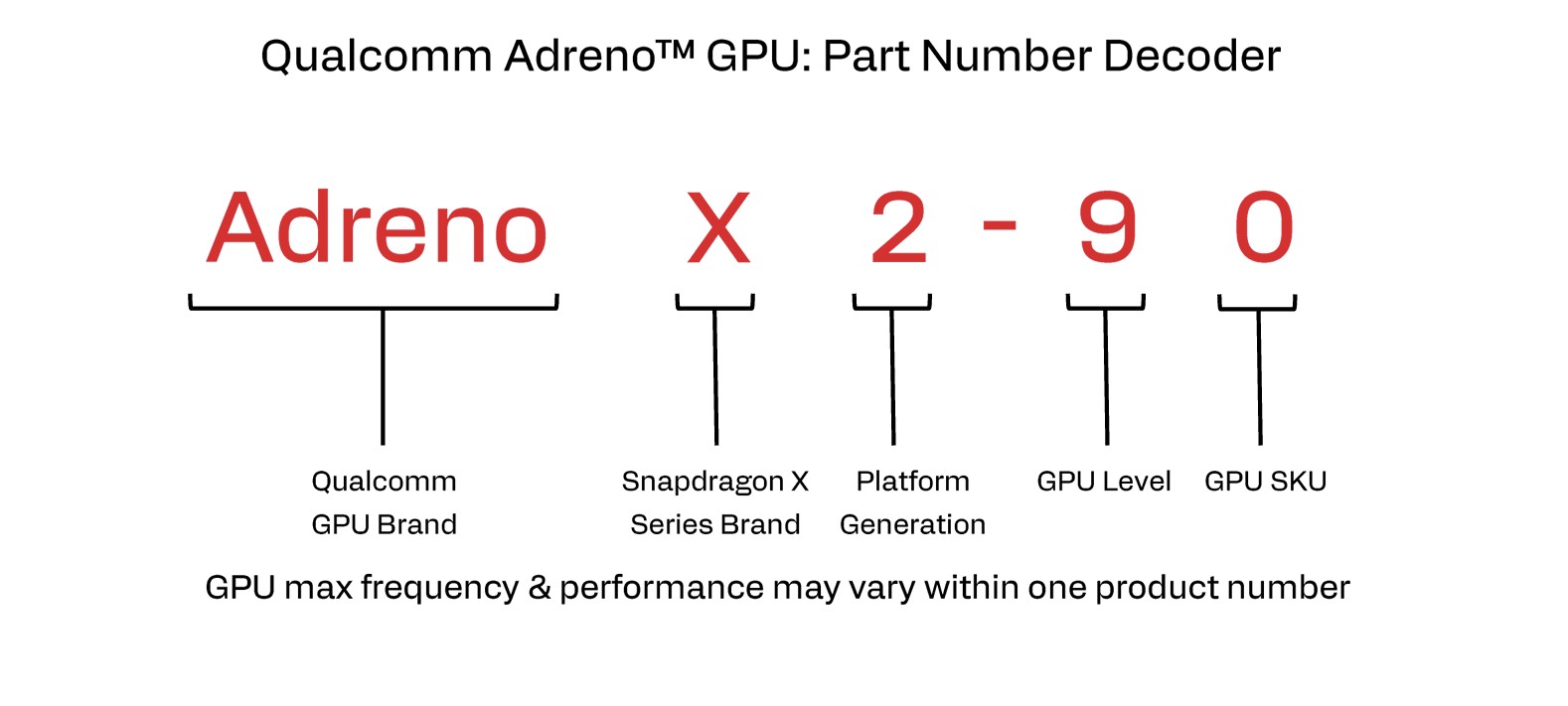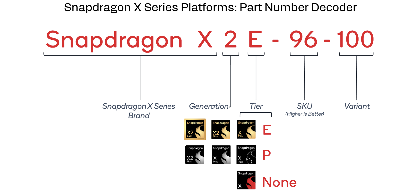 Considerando il numero di processori disponibili (vedere la tabella sottostante), questa nomenclatura può diventare rapidamente confusa e non è ideale per i clienti. Oltre ai modelli X2 Elite e X2 Elite Extreme, Qualcomm lancia anche due modelli X2 Plus per i dispositivi di fascia bassa. Come sempre, le prestazioni dei chip varieranno tra i diversi dispositivi a causa dei diversi limiti di potenza. Inoltre, i clock della GPU variano ancora una volta a seconda del modello di CPU, quindi anche se le due GPU condividono lo stesso nome (come Adreno X2-90), i clock e quindi le prestazioni possono variare sensibilmente.