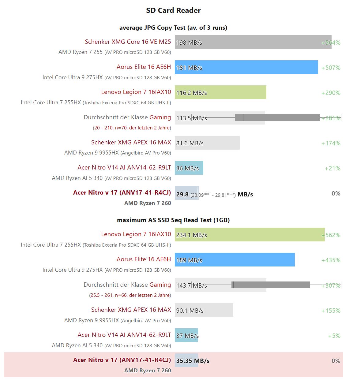 E in effetti, i modelli Nitro di Acer, come il modello Nitro V 14 e Nitro V 17 - sembrano essere gli unici portatili da gioco a prezzi accessibili che vengono ancora forniti con un lettore di schede SD. Nel 2024, il Gigabyte G5 e il Asus TUF Gaming A14 offrivano questa funzione, ma finora, nel 2025 e 2026, rimane solo la serie Nitro. Anche l' Asus TUF Gaming A18testato alla fine del 2025, non include più un lettore di schede.