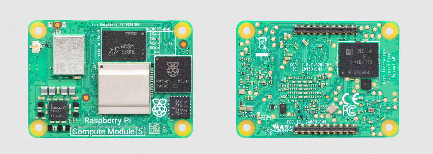 Come riferimento, il Raspberry Pi CM5 parte con 2 GB di RAM, mantenendo il fattore di forma del suo predecessore di 55 x 40 x 4,7 mm con fori di montaggio M2,5. La scheda può essere configurata con 4 GB o 8 GB di RAM, che possono essere configurati con 0 GB (CM5 Lite), 16 GB, 32 GB e 64 GB di memoria flash eMMC. Inoltre, Raspberry Pi CM5 può essere configurato con un modulo Bluetooth 5.0 e Wi-Fi 5 opzionale.