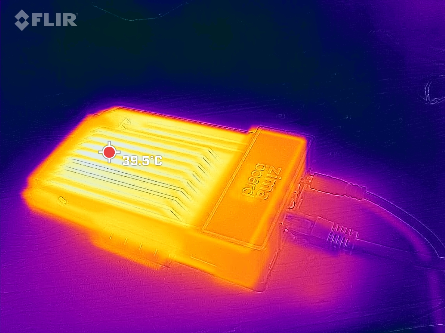 La Zimaboard non ha bisogno di una ventola attiva, è raffreddata passivamente e quindi è silenziosa. Le grandi alette di raffreddamento in metallo sono responsabili della dissipazione del calore residuo e conferiscono alla scheda un design inconfondibile. Poiché l'intero lato superiore è coperto dalle alette di raffreddamento, le temperature superficiali della Zimaboard sono molto limitate. Durante i periodi di inattività abbiamo misurato una temperatura di circa 32 °C (89,6 °F) sul lato superiore.