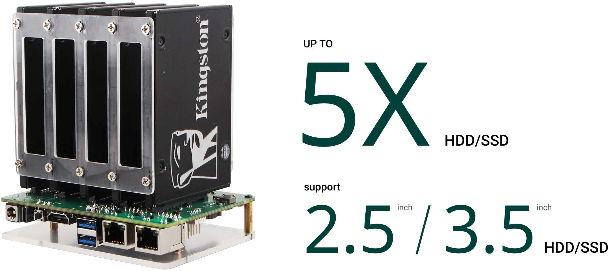 È incluso anche uno slot per schede microSD, dove di solito viene installato il sistema operativo. Questo offre agli utenti una grande flessibilità, sebbene siano anche responsabili dell'installazione e dell'aggiornamento del sistema operativo. Sono supportati i sistemi RAID 0, 1, 5 e 10. Sono disponibili intestazioni GPIO. Due porte USB 3.2 Gen 1 consentono di collegare dispositivi di archiviazione esterni.