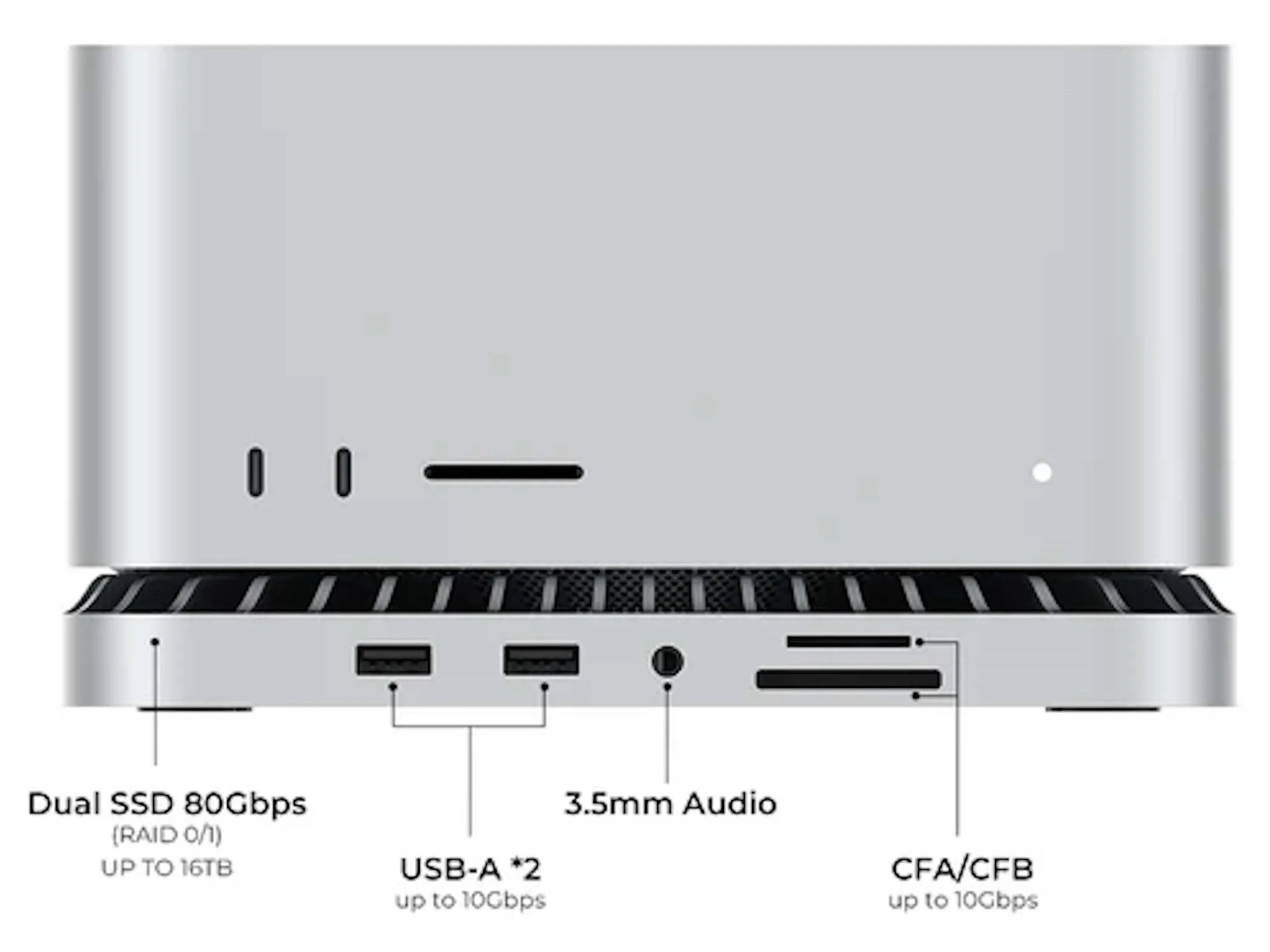 Il dock si collega al Mac Studio tramite Thunderbolt 5; i trasferimenti di dati avvengono fino a 80 Gbps. L'accessorio può ospitare due SSD, il che significa che è possibile aggiungere al Mac Studio fino a 16 TB di spazio di archiviazione. Sono supportate sia le configurazioni RAID 0 e RAID 1, sia le schede CFexpress con velocità fino a 10 Gbps. Inoltre, ci sono due porte USB 3.2 Tipo A e un jack per cuffie da 3,5 mm convenzionale.