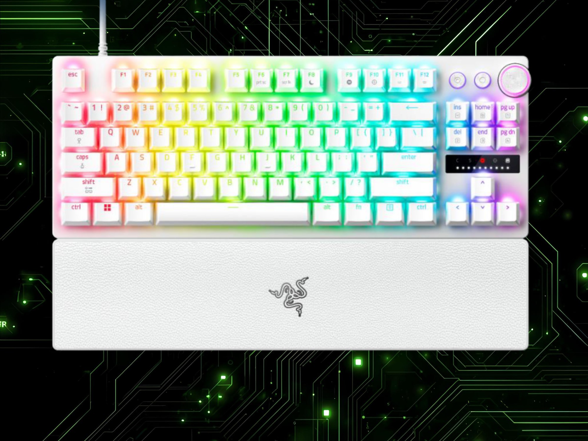 I test pratici del modello TKL hanno confermato che reagisce a un tocco leggero. Tuttavia, con un intervallo di attuazione da 0,1 mm a 4 mm, le impostazioni più elevate lo rendono più pratico per le attività di produttività. I giocatori possono anche regolare altre opzioni, come Tocco a scatto e Rapid Trigger, senza bisogno di Sinapsi 4. Il lato destro della tastiera cablata presenta controlli multimediali rimappabili e diversi indicatori LED.