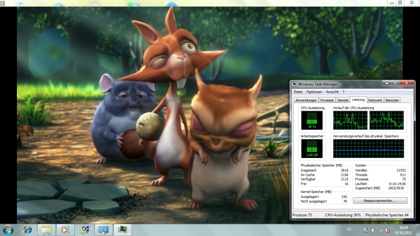 Almeno la scheda grafica integrata HD 6310 è perfetta per i videos 1080p grazie al decoder video UVD3. Il carico del processore non aumenta in modo significativo durante l'utilizzo mobile (20 - 60 percento). Altre applicazioni possono quindi essere eseguite senza influenzare il lavoro del 5253. Le seguenti immagini mostrano lo scenario durante il playback con contenuti 1080p e 720p quando si lavora con la batteria. Ci si attesta sul 20%.