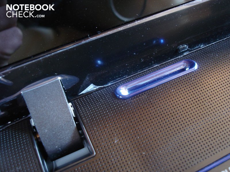 Il case è in plastica ed è stato ben costruito. Le superfici molto lucide sono molto sensibili e tendono a sporcarsi presto. La cover blu scuro, la tastiera bianca illuminata ed i punti di appoggio dei polsi ruvidi danno un aspetto piacevole. Non c'è molto da lamentarsi in termini di stabilità, ad eccezione, in alcuni posti della cover del display. Le cerniere sono stabili e reggono bene l'ampio display. Tuttavia, il case oscilla in parte anche in considerazione di un peso di quasi 4 chilogrammi e dobbiamo dire che anche gli angoli di apertura sono molto limitati.