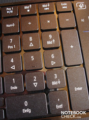 La tastiera è piacevole da usare anche dopo parecchie ore. La digitazione è molto agevole grazie alla corsa breve ed alla battuta precisa. Grazie al fatto che Acer utilizza un buon layout, i tasti hanno una buona dimensione e l'Aspire 8942G ha anche un tastierino numerico, che ben presto utilizzerete. Inoltre, l'illuminazione bianca della tastiera fornisce un perfetto orientamento anche al buio più completo. Ma ci sono due note dolenti: sia i tasti cursore che il tasto shift sinistro sono troppo piccoli. Un punto di forza degli elementi di controllo è il maneggevole multimedia control a destra della tastiera. Il regolatore del volume molto grosso attira la vista in modo particolare.