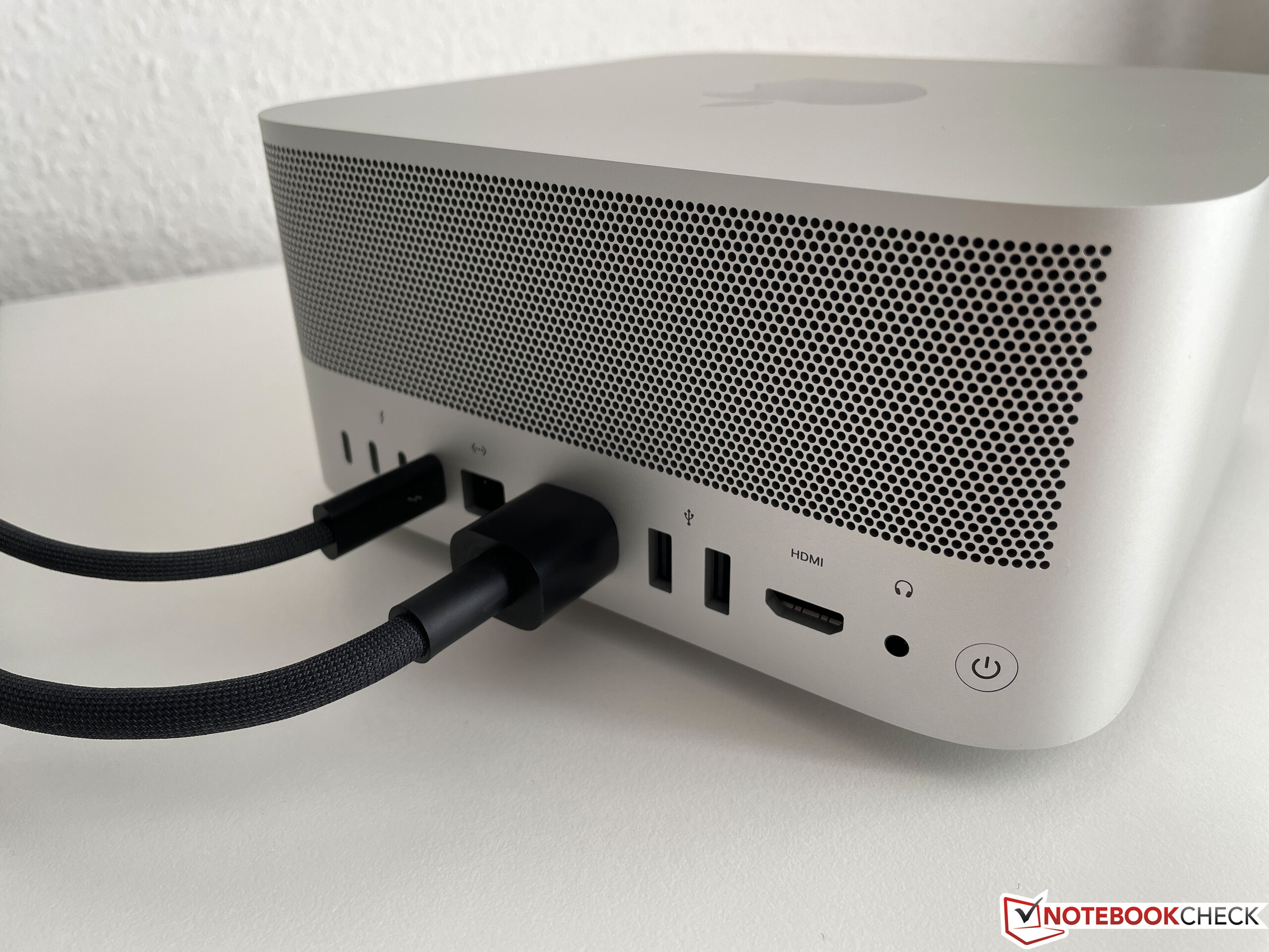 La parte anteriore ospita il LED di stato, due porte USB-C (o due Thunderbolt 4 sul Mac Studio con l'M1 Ultra), il lettore di schede e il pulsante di accensione. Il resto delle porte si trova sul retro. Sono identiche su entrambe le versioni e comprendono quattro porte Thunderbolt 4 (USB-C), due porte USB-A normali e una porta Ethernet da 10 GB. Inoltre, anche l'uscita audio e l'uscita HDMI 2.0 si trovano qui.