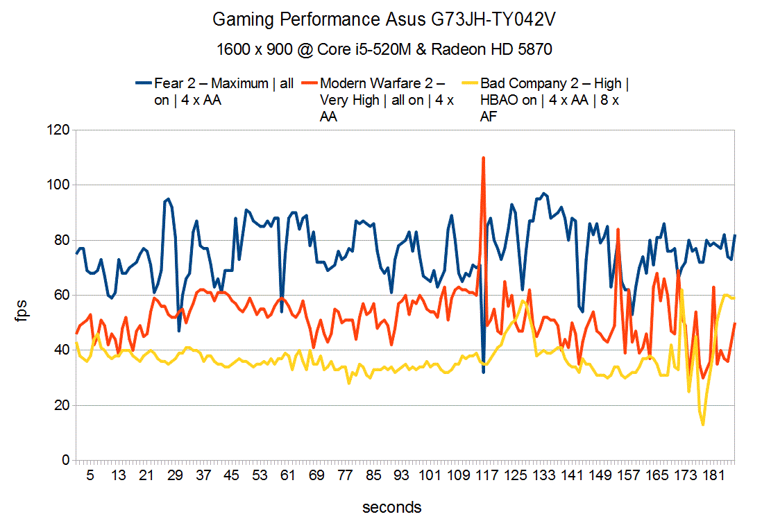 Raramente abbiamo mai visto simili prestazioni di gioco su di un notebook che viene venduto a meno di 1400€. La ATI Mobility Radeon HD 5870 può far girare in maniera fluida tutti i giochi che abbiamo provato alla sua risoluzione nativa di 1600 x 900 con impostazioni di dettaglio elevate e spesso con miglioramenti grafici aggiuntivi (AA e AF). Fino a che i requisiti minimi delle prossime generazioni di giochi rimarranno simili a queste, il G73 garantirà una solida piattaforma di gioco che non sarà superata da sviluppi tecnologici per almeno altri due anni. Questo finché i giochi non richiederanno i processori quad-core per girare.
