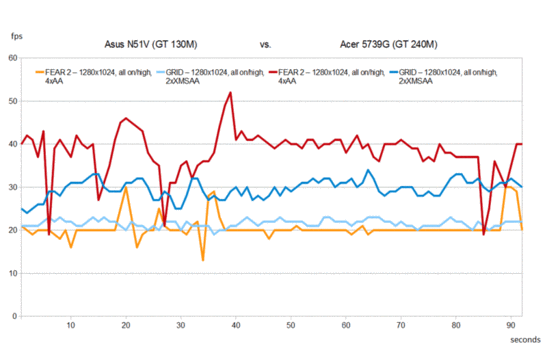 L'unico gioco di guida, come per FEAR 2, è giocabile in modo fluido solo abbassando il livello di dettaglio. Così è stato possibile ottenere 40,5 fps con dettaglio medio a 1024 x 768. Grid arrancava a 21,6 fps a 1280 x 1024, 2xMSAA e un livello di dettaglio alto. La GT 240M con dettagli alti garantisce 29,7 fps e la HD 4650 un considerevole valore di 40 fps.