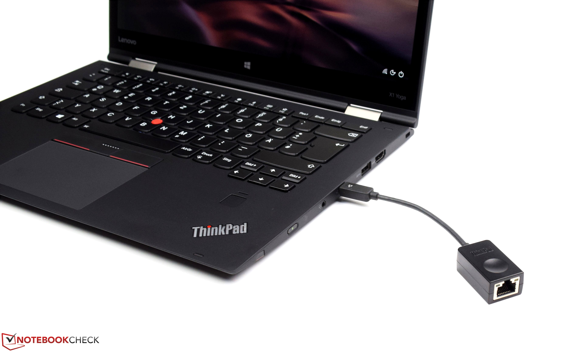 In aggiunta al modulo WLAN, il ThinkPad X1 Yoga 2017 monta una porta Mini-RJ45. L'adattatore consente la connessione con cavi normali, il che è ideale per trasferimenti affidabili di dati a 1 Gbit/s.
