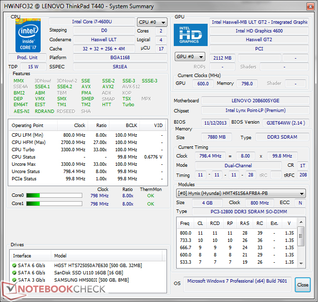 Lenovo ha preso una decisione netat per l'attuale generazione ThinkPad: Gone sono dispositivi da ufficio spessi ma molto potenti, ore avete portatili sottili e mobile con gli ultimi componenti ULV Intel. Il predecessore ThinkPad T430 montava ancora chips high-performance come l'i7-3520M (da 2.9 a 3.6 GHz, TDP di 35 Watts), ma l'attuale T440 è disponibile solo con frugali CPUs ULV della serie Intel Haswell U-series. Il chip più potente è l'i7-4600U, usato anche sul nostro modello. Gira da 2.1 a 3.3 GHz con un TDP di appena 15 Watts, pertanto le specifiche sono inferiori rispetto al predecessore. Tuttavia, a quanto ammonta lo svantaggio in termini di prestazioni CPU? Quali vantaggi possono aversi?