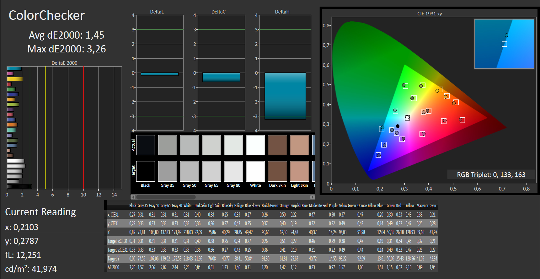 Ulteriori motivi per cui il display non risulta adatto per applicazioni professionali nel settore dell'elaborazione di immagini emerge da ulteriori tests del display. Mentre uno migliora nettamente i pessimi valori iniziali in termini di grigi e risoluzione tramite calibrazione, questo è solo parzialmente possibile per quanto riguarda la saturazione e la precisione del colore. Soprattutto anche il rosso, il blu ed il magenta non raggiungono valori DeltaE 2000 inferiori a 5. Quindi, manca la gamma di colore necessaria, ad esempio il rosso puro non viene riprodotto più. Per colori mischiati questo effetto è meno evidente, in quanto in questo caso l'assenza di spettro di colore può essere parzialmente bilanciato.