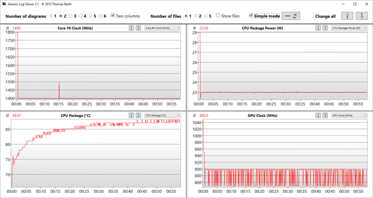 Abbiamo già detto dello sviluppo di temperature nel Cinebench loop, e possiamo confermare questo comportamento nello stress test. Fino a 52 °C sulla parte superiore dell'unità base e fino a 48 °C sul lato inferiore sono poco meno rispetto al loop della CPU. Il seguente diagramma, illustra il comportamento del SoC durante lo stress test: il consumo energetico è costante a 23 W (1.4 GHz GPU, 850-900 MHz GPU), mentre le performance sono ridotte a 15W con la sola batteria (1.2 GHz CPU, 700 MHz GPU).