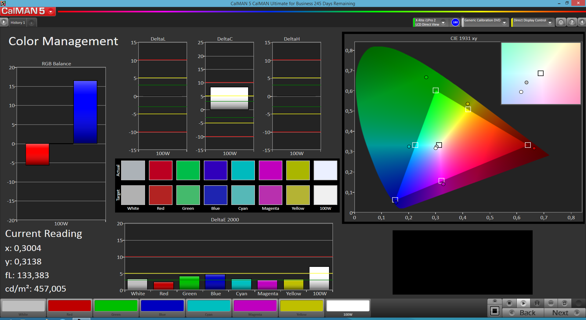 Continuiamo i rilievi del display con un colorimetro e con il software CalMAN. Abbiamo rilevato la precisione del colore, ad esempio, rispetto alle gamme sRGB o AdobeRGB. Il panello con convince con scarse deviazioni DeltaE. Mentre i colori scuri sono abbastanza precisi, possiamo vedere deviazioni maggiori per i colori chiari e per i grigi che hanno una leggera tendenza al blu, il che non è compensato dalla pesante sotto saturazione del colori blu.