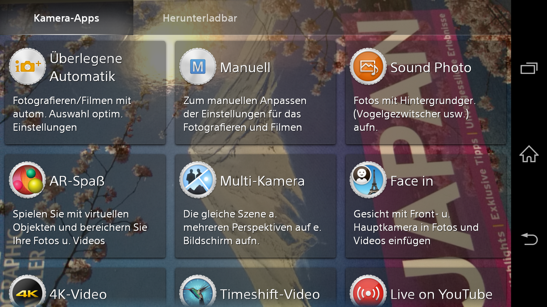 Ci sono anche molte altre apps per la fotocamera, inclusi gli effetti blur per il background, ed anche altrei, o un'app per la trasmissione live su YouTube. Sony promette che continueranno ad aggiungere nuove apps. In questo modo, la fotocamera può essere migliorate sempre di più. Rispetto all'Xperia Z2, ci sono molte apps in più, ma la loro funzionalità non è estremamente determinante.