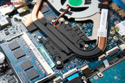 Siamo curiosi di vedere come appare all'interno l'XPS 14z. Dopo una rimozione del pannello di accesso piuttosto difficoltosa sul lato inferiore del portatile, che oltre alle viti ha anche dei ganci in plastica, abbiamo avuto accesso ai componenti interni. In questo modo è possibile rimuovere l'hard drive, così come le barre di RAM, per la sostituzione. E' possibile anche rimuovere la polvere che si accumula sulle alette dei dissipatori.