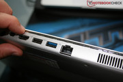 La maggioranza delle porte del Dell XPS 15z si trovano sulla sinistra del case verso il retro, rendendole accessibili ma lontano da aree di lavoro accanto al portatile. Con l'XPS 14z, tuttavia, quasi tutte le porte sono migrate nell'estremità posteriore. Di principio una buona idea; ma quando non si vede nemmeno una sola porta USB, ad esempio per la connessione di una penna usb o di una digicam, smartphone o altri piccoli dispositivi, questo apparente vantaggio si trasforma in uno svantaggio.