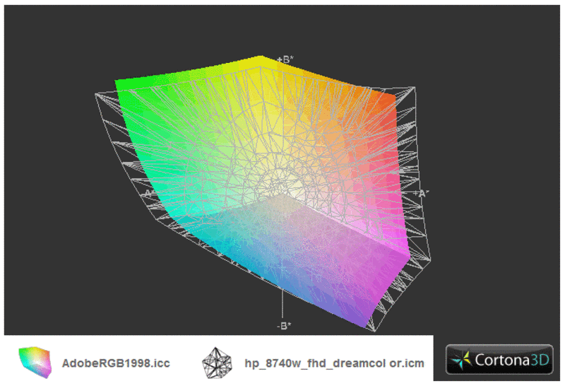 Lo spazio dei colori sRGB può essere coperto completamente. Lo spettro di colore Adobe RGB è ben coperto secondo i nostri rilievi. Pertanto gli schermi dei consumer sono battuti, con uno spettro di colore esteso. Possiamo citare ad esempio l'HP Envy 14 con display Radiance o gli ultimi Macbook Pros.