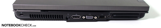 Una potenziale workstation necessita di una cosa in particolare: una connettività completa. HP ha inserito molte porte nel case nonostante questo sia molto sottile. Il posizionamento inizia con una combinazione di lettore smartcard e slot ExpressCard sulla sinistra del case. A seguire ci sono una Firewire 1394a, una USB 2.0, VGA, porta display ed il socket per l'adattatore. Abbiamo inoltre uno slot Kensington lock inserito nell'angolo posteriore vicino alla fessura per l'espulsione dell'aria.