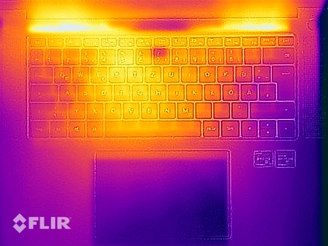 Il case del MateBook 16 difficilmente si riscalda durante le attività quotidiane/carichi bassi. Quando il dispositivo è messo sotto carico, lo sviluppo di calore è principalmente contenuto nell'area posteriore centrale del fondo dell'unità base dove abbiamo misurato un hotspot di 50 °C. Il dispositivo può ancora essere usato sulle ginocchia, anche in queste condizioni, poiché quest'area del dispositivo di solito non è a diretto contatto con il corpo. Sulla parte superiore dell'unità base, gli utenti sentiranno la tastiera riscaldarsi leggermente durante lo stress test, ma questo non porterà a nessuna restrizione