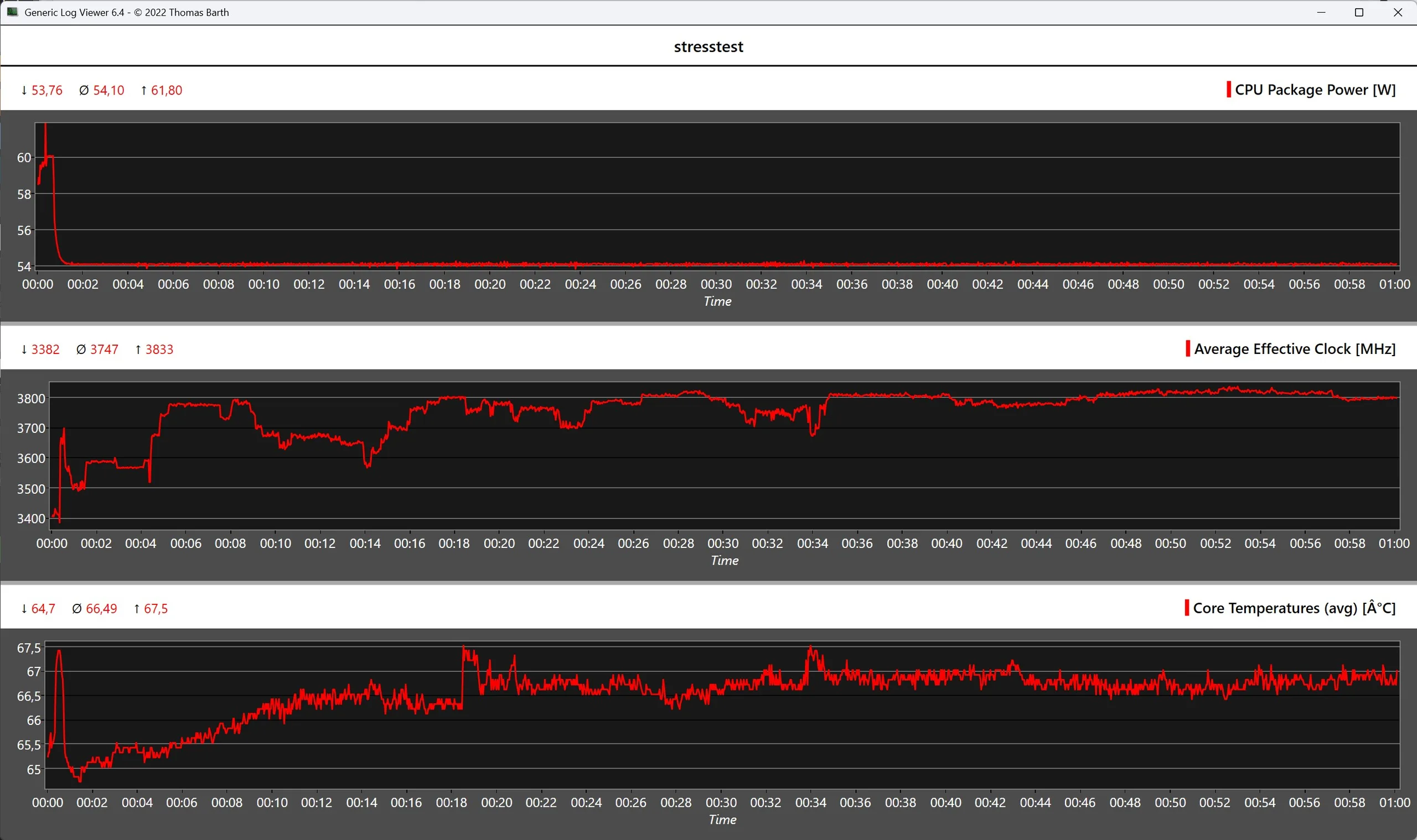 Dal punto di vista termico, il Minisforum AI X1 Pro è in condizioni eccellenti. Anche in condizioni di pieno carico prolungato, l'involucro si riscalda a meno di 40 °C, mentre il SoC rimane chiaramente nell'intervallo non critico, con un massimo di 67,5 °C.