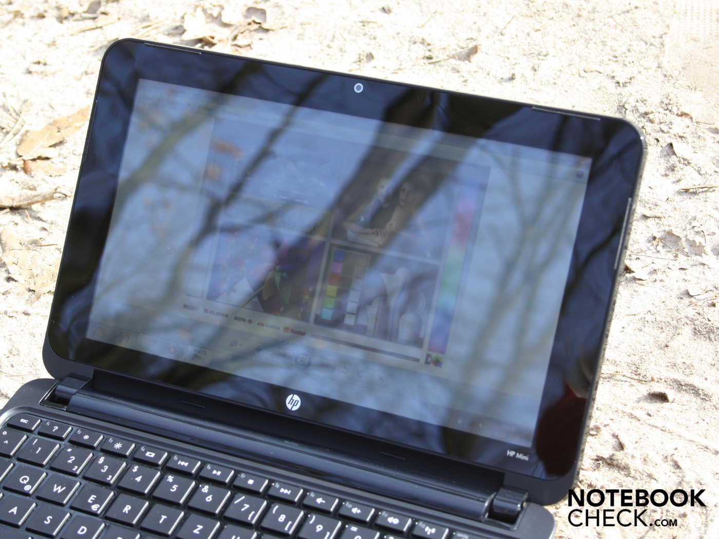 L'ampia autonomia della batteria e l'aspetto carino vi invitano ad utilizzarlo all'aperto. Tuttavia, controllare la posta mentre bevete un drink all'esterno di un bar non sarà un piacere. I riflessi e la scarsa luminosità sono un fastidio. Il rivestimento in plastica dello schermo peggiora anche le cose. Specialmente i riflessi possono richiederebbero una luminosità superiore ai 250 cd/m². Ma, per come stanno le cose, l'utilizzo sotto la luce del sole non è divertente.