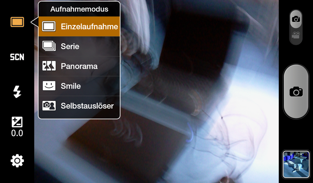Il layout dell'applicazione per la videocamera è ben progettato, Con l'icona sinistra, potete facilmente gestire le varie opzioni per le immagini ed i video. L'otturatore si chiude ed la foto viene scattata semplicemente premendo l'icona a destra. Un LED particolarmente luminoso accanto alla lente si propone di migliorare la qualità delle foto notturne.