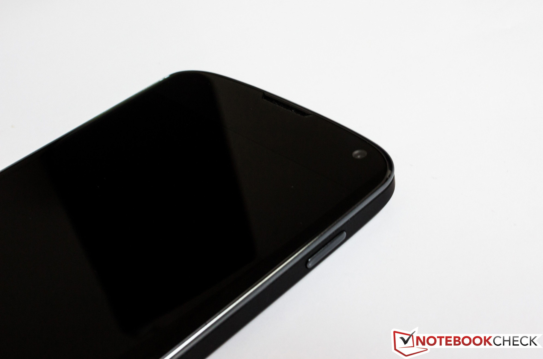 Il design of Google's Nexus 4 non ha subito alcuna evidente modifica rispetto al Samsung Galaxy Nexus. Si tratta ancora di un blocco nero uniforme a primo aspetto. Tuttavia, si nota subito che sono stati utilizzati vari materiali e non possiamo considerarlo un design sconsiderato guardandolo da vicino. Proprio come la gamma iPhone 4, la cover posteriore non removibile è in vetro. Di conseguenza, quasi tutte le superfici del dispositivo sono in vetro. Solo il bordo è in componenti di policarbonato. La parte inferiore, è prevalentemente in nero matto e comprende sia i pulsanti hardware che le porte. La parte superiore ha un colore argento scuro e serve come base del display. Le estremità destra e sinistra del display hanno una leggera curvatura verso il basso. Il Samsung Galaxy S3 ha una simile curvatura ma in direzione esattamente opposta. La base del display non fuoriesce e di conseguenza non fornisce allo schermo una ulteriore protezione contro i graffi.
