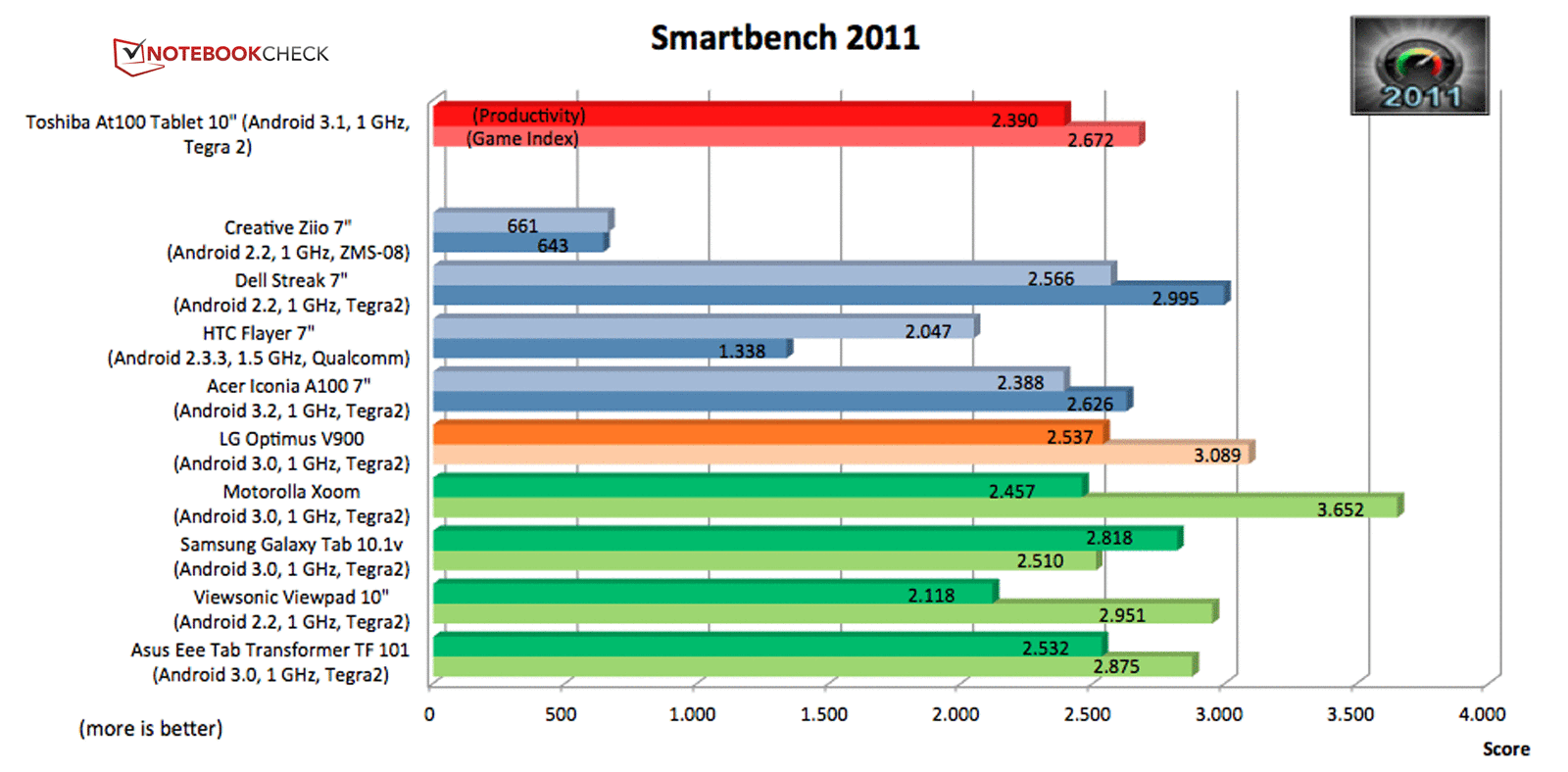 Il tablet recupera con il benchmark Smartbench: tornando ancora al terzo posto con 2390 punti nel benchmark di produttività e 2672 punti nel game index.