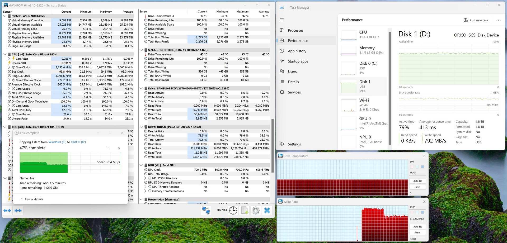 In base alle specifiche tecniche dell'SSD Orico M20, si prevede che il dispositivo raggiunga una velocità di trasferimento fino a 2.000 MB/s. L'azienda non specifica se questa cifra si riferisce alla velocità di lettura o di scrittura. Quando si utilizza una connessione ottimale, l'SSD si avvicina alla velocità pubblicizzata per la lettura sequenziale. In coppia con l'Asus NUC 14 Pro+, siamo riusciti a raggiungere un solido 1.676 MB/s per la scrittura. Nell'uso quotidiano, l'SSD si comporta in modo eccezionale per trasferire rapidamente grandi volumi di dati.