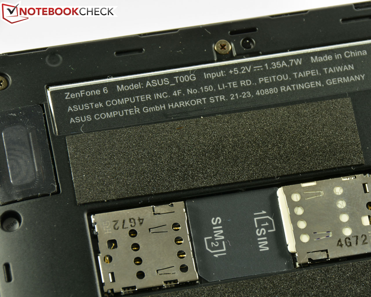 Asus equips the Zenfone 6 A600CG with a frugal Intel Atom Z2580 dual-core processor clocked at 2.0 GHz as well as the integrated PowerVR SGX544MP2 and 2 GB of memory. The internal flash storage has a capacity of 16 GB with around 12 GB for the user. The internal storage can be expanded with microSD cards up to a capacity of 64 GB. Asus also includes 5 GB of its own web storage. The App2SD feature works with the majority of apps. The two micro SIM slots support 3G/UMTS. Unfortunately LTE is not included, even though other rivals in this price range offer 4G functionality. The micro SIM slots as well as the microSD slot are behind the detachable back cover. The mandatory micro USB 2.0 slot, and the 3.5 mm stereo jack are obviously available as well. The physical power button and volume rocker work reliably and have a convenient position.