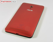 The detachable back cover of the Asus Zenfone 6 A600CG is made of matte red polycarbonate. The rest of the case is made of black plastic, and the display is covered with sturdy Gorilla Glass 3. The matte plastic at the back makes the smartphone very easy to hold, and thanks to the slight curve at the back, it also feels very good in the hand and does not really attract fingerprints. With a thickness of 9.9 mm (~0.39 inches), and a weight of 200 grams (~7 ounces), the Zenfone 6 is not really compact enough for a smartphone, but it is still decent for a 6-inch phablet. This impression is also supported by the comparison with its rivals. Our review sample is well-built, and has even gaps. Our pressure test does not result in creaking sounds, and the twisting is still acceptable. We also liked the volume rocker and the power button that are made of ribbed aluminum. Only drawback: The back cover is very firm, which increases the stability of the case, but it is also pretty tough to remove.