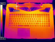Anche le temperature non sono ottimali. Il case rimane su valori discreti, tra 24 e 30 °C (~75.2 - 86 °F) con il notebook in attesa, mentre la parte inferiore della base può raggiungere i 60 °C (~140 °F) a pieno carico. Non si raccomanda quindi di effettuare lunghe sessioni di gioco tenendo il notebook in grembo. La situazione è un po' migliore nella parte elevata del case. Il nostro strumento di misurazione ha indicato un massimo di 47 °C (~116.6 °F), anche se il poggiapolsi si scalda più di quanto molti potenziali acquirenti possano sopportare.