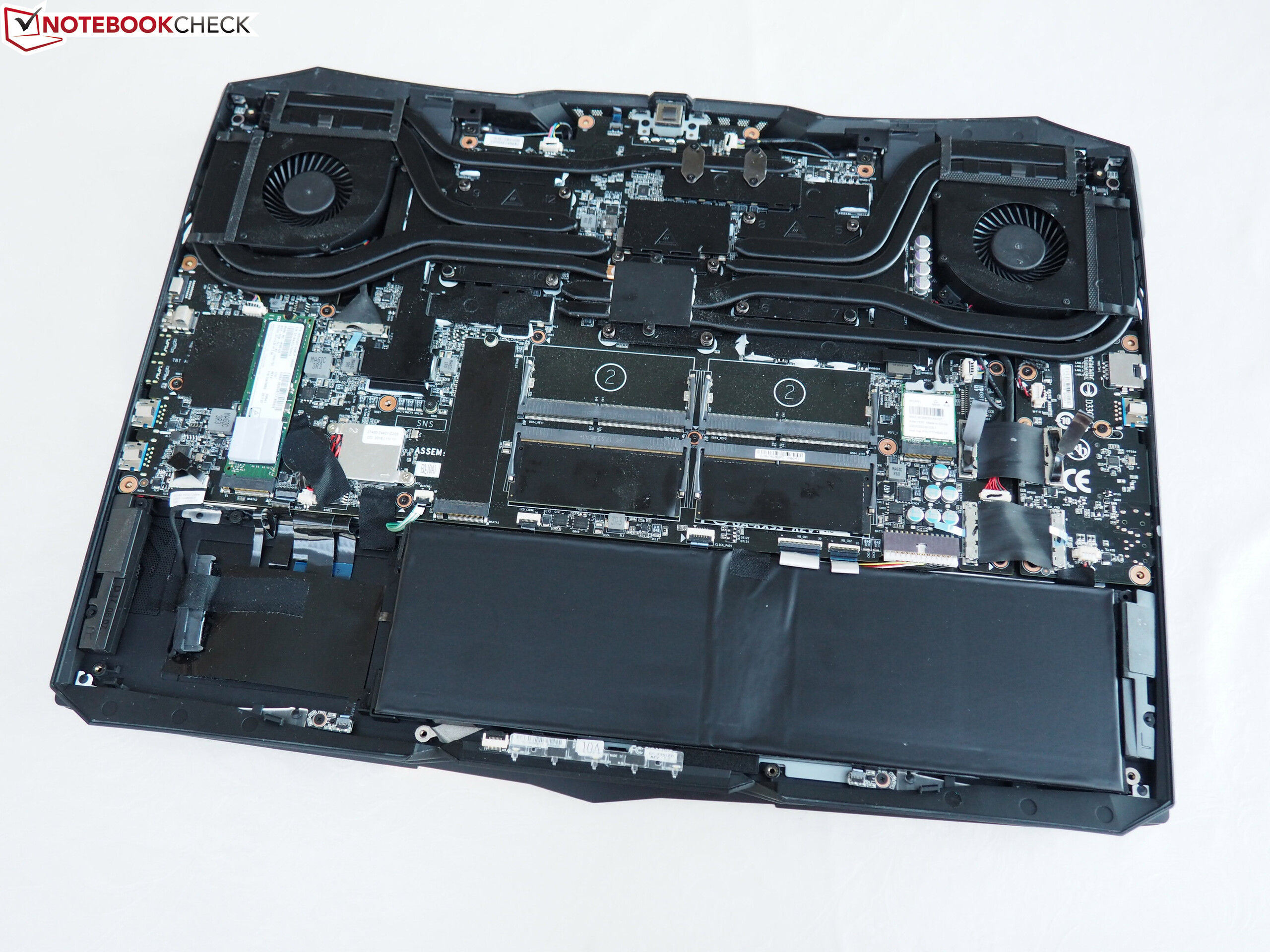 Le opzioni per la manutenzione di questo dispositivo da 17 pollici ci hanno lasciato con impressioni contrastanti. Al giorno d'oggi è normale la necessità di rimuovere l'intero coperchio inferiore per accedere alle parti interne, ma in questo caso non solo si devono svitare 16 (!) viti Torx (TX6), ma anche agire su diverse clip a tenuta molto forte difficili da sbloccare senza rischiare di danneggiare il dispositivo. Gigabyte potrebbe anche migliorare la protezione dalla polvere. Una parte abbastanza ampia della scheda madre era ricoperta di microparticelle polverose dopo sole 10 ore di utilizzo (basta guardare le foto). Non abbiamo mai visto così tanta polvere in altri dispositivi gaming, probabilmente a causa delle diverse fessure per l'aria. Inoltre, la batteria non è avvitata e può cadere facilmente quando si apre la base. Se si escludono questi dettagli, la manutenzione presenta aspetti interessanti. Il modulo wireless, la RAM (quattro slot per un massimo di 64 GB) e i dispositivi di archiviazione (due slot M.2 2280 con supporto PCIe/NVMe e vano da 2.5 pollici) possono essere rimossi o sostituiti. Il sistema di raffreddamento consiste in due ventole con quattro heatpipe ciascuna per CPU e le due GPU.