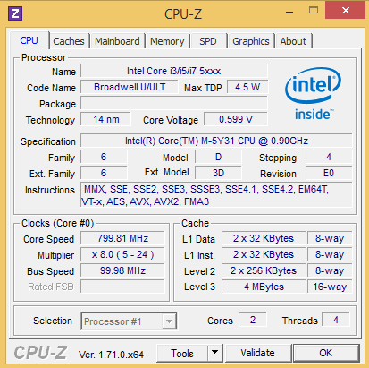 Simile allla HD Graphics 5500, l'HD Graphics 5300 della serie Core M ha 24 Execution Units (architettura Intel Gen. 8, supporto DirectX 11.2), che girano a 300-850 MHz in questo caso. Questa gamma è utilizzata in modo abbastanza completo nei benchmarks brevi, quindi le prestazioni 3D sono di appena il 20% dietro dispositivi come l'XPS 13 con sistema di raffreddamento attivo. Tuttavia, questo funziona solo in quanto il Core M può consumare oltre 10 Watts quando le temperature sono basse. Sia i clocks che le performance crolleranno in modo significativo una volta che lo chassis si sarà scaldato - ma vedremo meglio nella prossima sezione.
